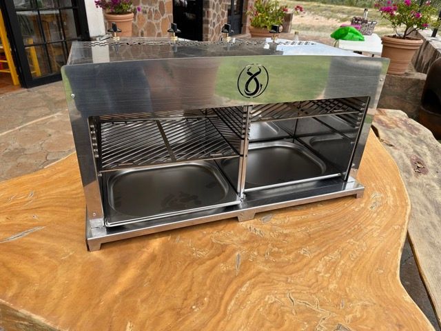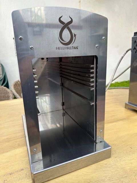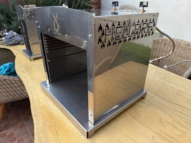 El Hellfire800plus con dos quemadores y mucho más espacio para los alimentos a asar es perfecto tanto para uso privado como comercial. Técnicamente, se diferencia del pequeño Hellfire800 sólo por sus dos quemadores.